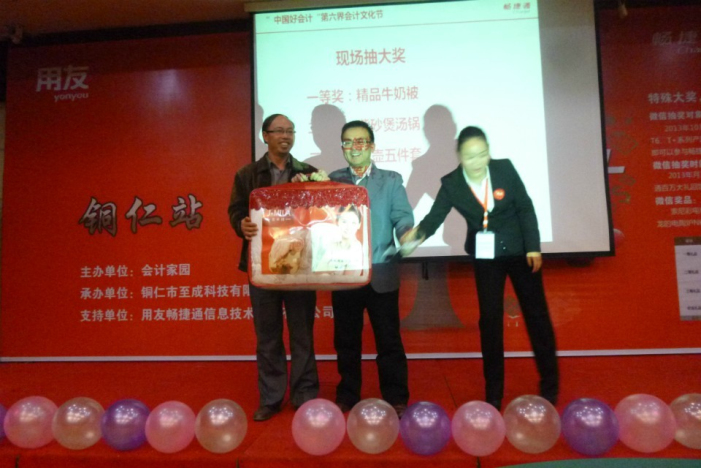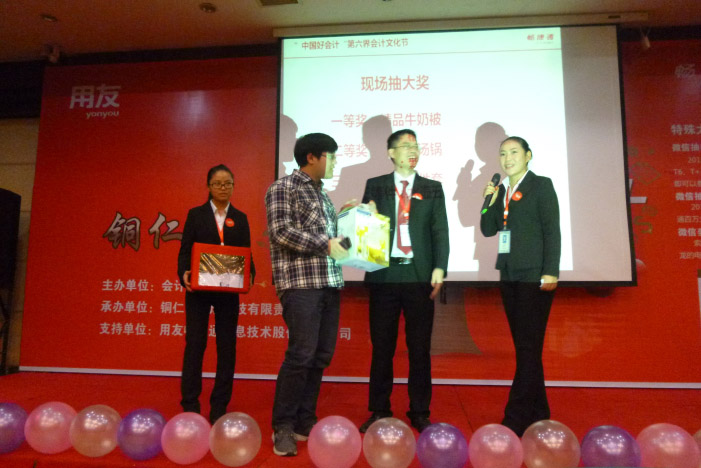 3、本届文化节的抽奖形式除了现场抽奖外还加入了——微信抽奖,分别是铜仁至成制作微信二维码扫描和用友畅捷通网络互动部提供微信大转盘抽奖,奖品是价值1000元的会计家园学习卡和价值550元的京东购物卡 。