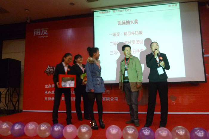 3、本届文化节的抽奖形式除了现场抽奖外还加入了——微信抽奖,分别是铜仁至成制作微信二维码扫描和用友畅捷通网络互动部提供微信大转盘抽奖,奖品是价值1000元的会计家园学习卡和价值550元的京东购物卡 。